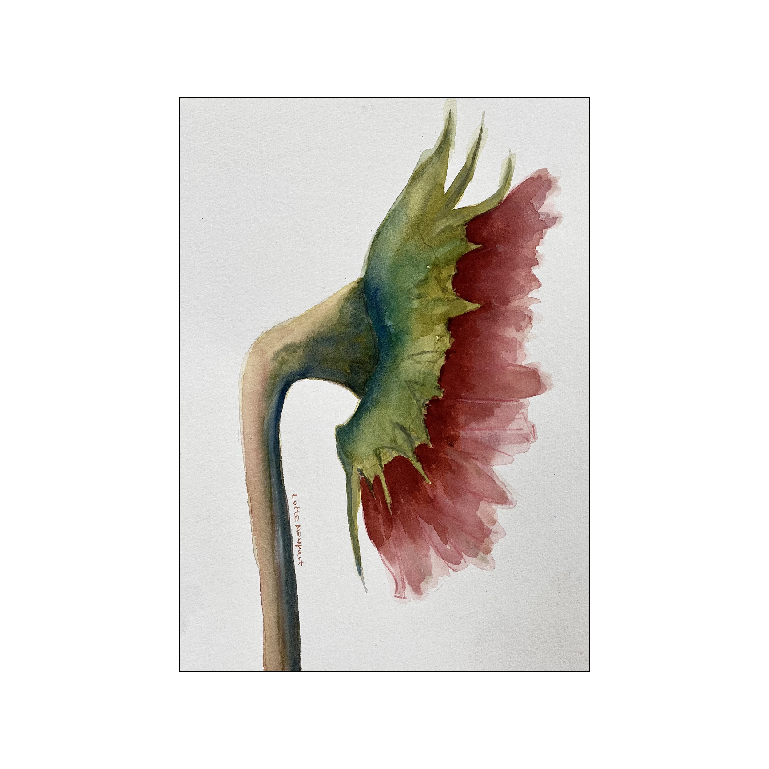 Akvarel af en solsikke set fra siden. Den er stadig farverig og stærk, men om lidt kommer efteråret og den vil begynde at visne. Stadig smuk i sit forfald.