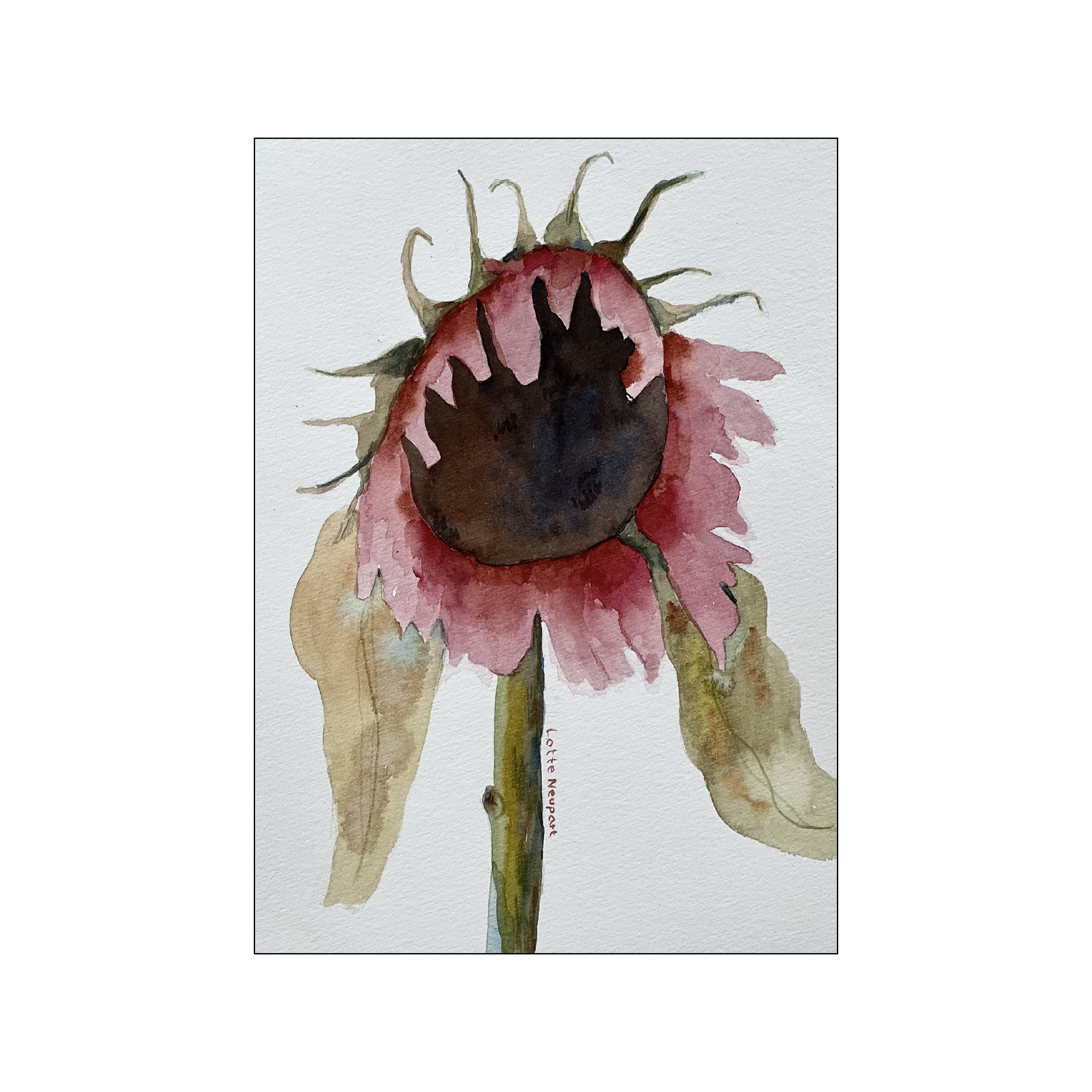 Akvarel af en solsikke der nærmer sig efteråret. Hovedet begynder at vende lidt nedad og bladene begynder at miste farve. Det er livets cyklus.